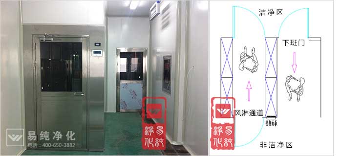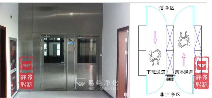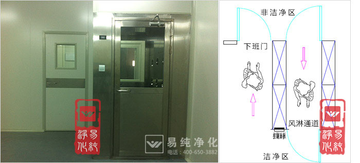 上圖即為下班通道和風(fēng)淋并排安裝,左為下班通道,右為進(jìn)入風(fēng)淋室;