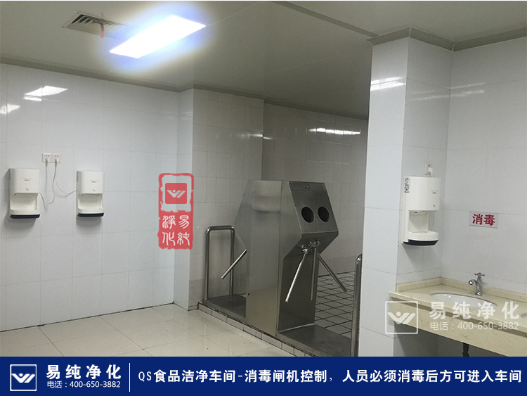 員工全部換衣后,需要進入風淋室待等待區,在等待緩沖區,有員工著衣指南,同時配有更衣鏡,員工必須要對照圖片指南進行自己的衣著檢查,另外在此處還有一位工作人員需要檢查員工的首飾配帶和衣著整潔,穿戴是否正確。車間規定,任何進入車間的作業人員均不可配帶手飾且需要檢查手指甲的長度,指甲超過規定長度的均不可進入車間。在全部符合要求后,人員通過風淋室吹淋,風淋室為全自動感應風淋室,且帶有電子互聯鎖功能,員工只有經過風淋之后方可進入腳消毒池,員工腳部消毒后進入下一個環節,就是洗手消毒環節。此處有專門的車間管理人員辦公室,管理人員會監督員工進入洗手。在消毒之個環節,企業更是不異重金采購消毒閘機控制系統,員工必須將雙手伸手閘機對手部進行消毒后方可進入車間,消毒閘機配置了消毒液,當員工將手伸入消毒孔內,閘機感應裝置自動噴灑殺菌裝置對人員手部進行消毒,同時閘機開啟,且只能一人使用一次,這樣可以強制保障每位員工必須手部消毒方可進入車間。